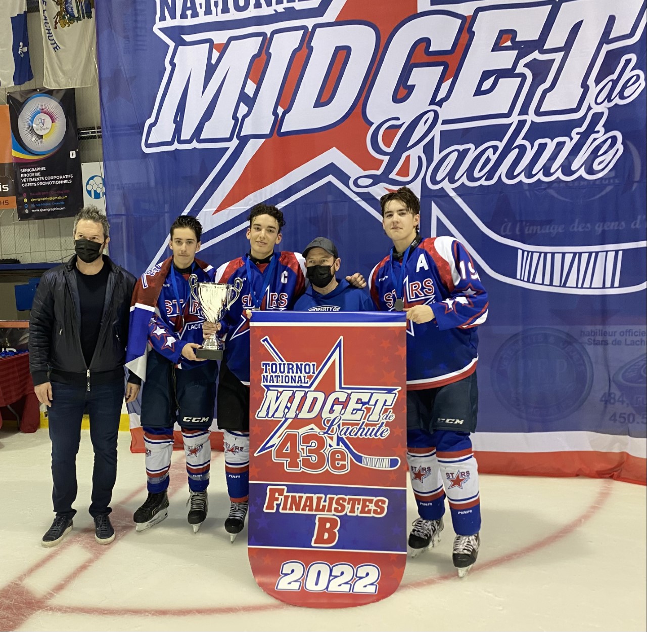 Mathieu Sabourin, président d’honneur du Tournoi national midget de Lachute 2022, a remis la bannière finaliste au capitaine Zakary Louis-Seize…